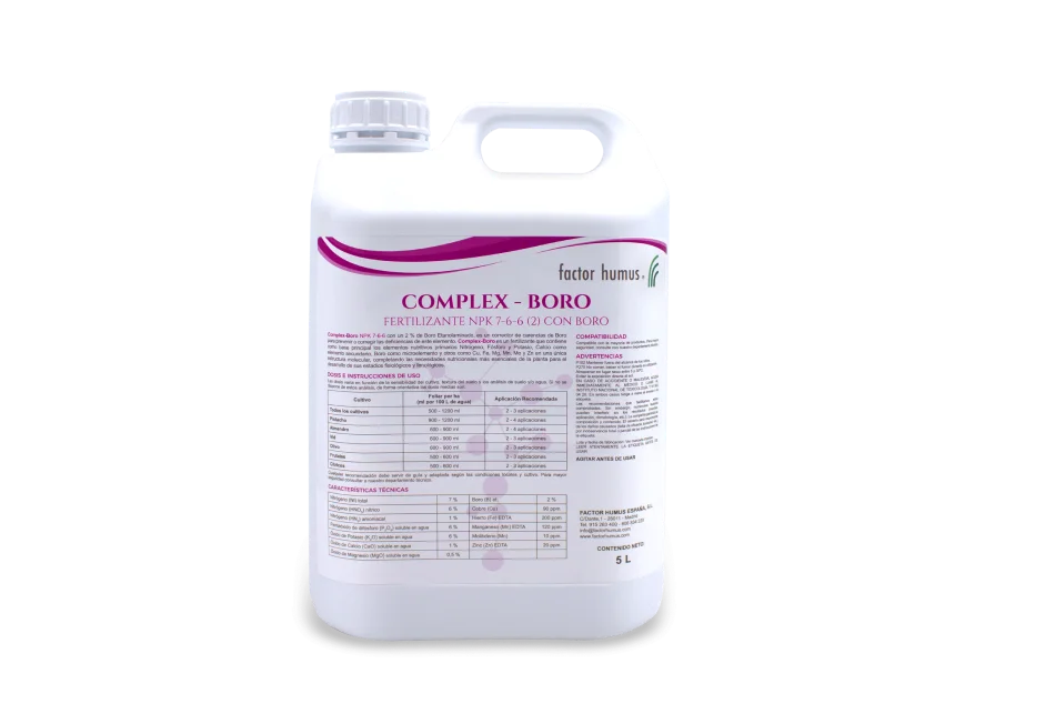 Complex-Boro es un fertilizante líquido NPK 7-6-6 con un 2% de Boro etanolaminado, diseñado como un corrector de carencias para prevenir o corregir deficiencias de este elemento. Este fertilizante contiene como base principal los elementos nutritivos primarios Nitrógeno, Fósforo y Potasio, junto con Calcio como elemento secundario, y Boro como microelemento, además de otros nutrientes esenciales como Cu, Fe, Mg, Mn, Mo y Zn, todo en una única estructura molecular. Complex-Boro regula el pH del caldo en un intervalo que va desde 5.5 a 6.5 y se puede aplicar con electroconductividades de hasta 12 dS/m sin riesgo de dañar a los cultivos.