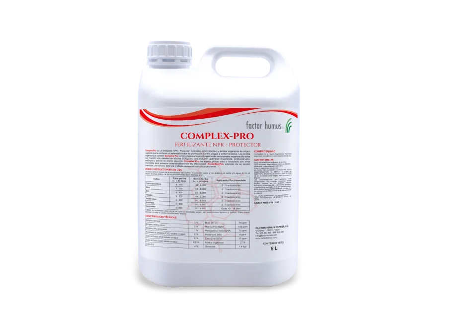 Complex-Pro es un fertilizante NPK – Protector. Contiene antioxidantes y ácidos orgánicos de origen vegetal, lo que le confiere un potencial elicitor de protección contra plagas y enfermedades.