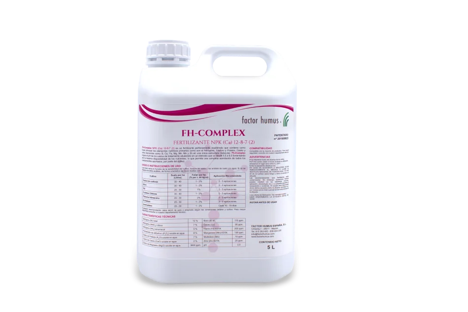 Es un fertilizante líquido con Nitrógeno, Fósforo y Potasio, Calcio y oligoelementos en una única estructura molecular. Esta tecnología permite que el cultivo absorba todos sus componentes al mismo tiempo. Fh-Complex regula el ph de los caldos de tratamiento en un intervalo que va desde 5.5 a 6.5. Fh-Complex se puede aplicar con electro conductividades de hasta 12 dS/m sin riesgo de dañar a los cultivos.