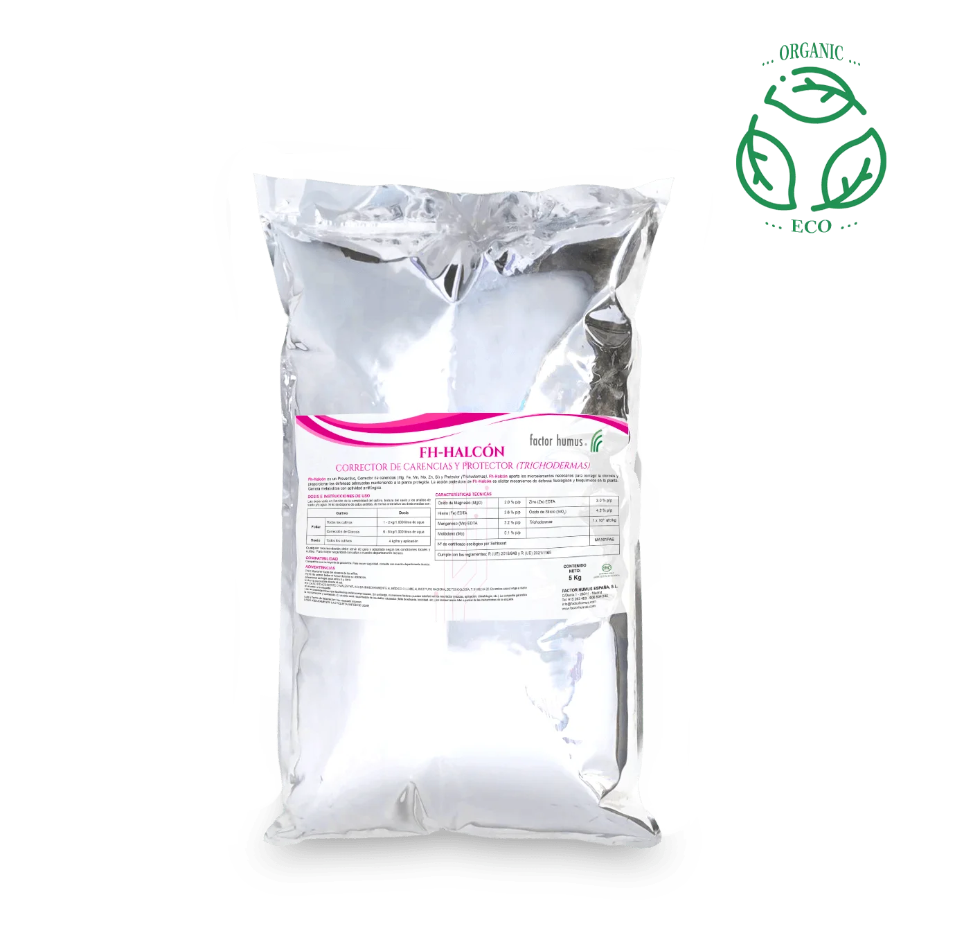 Fh-Halcón es un complemento nutricional, preventivo y corrector de carencias (Mg, Fe, Mn, Mo, Zn, Si) y protector fúngico (Trichodermas).