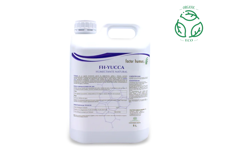 Fh-Yucca es un agente humectante natural basado en extracto de yucca Sarsaponin Schidegera, que contiene saponinas esteroidales. Estas saponinas actúan como surfactantes naturales, reduciendo drásticamente las tensiones superficiales del agua. Al aplicarse al suelo, Fh-Yucca mejora la interacción con las células de las raíces, incrementando la absorción de agua y nutrientes para un crecimiento óptimo de las plantas.