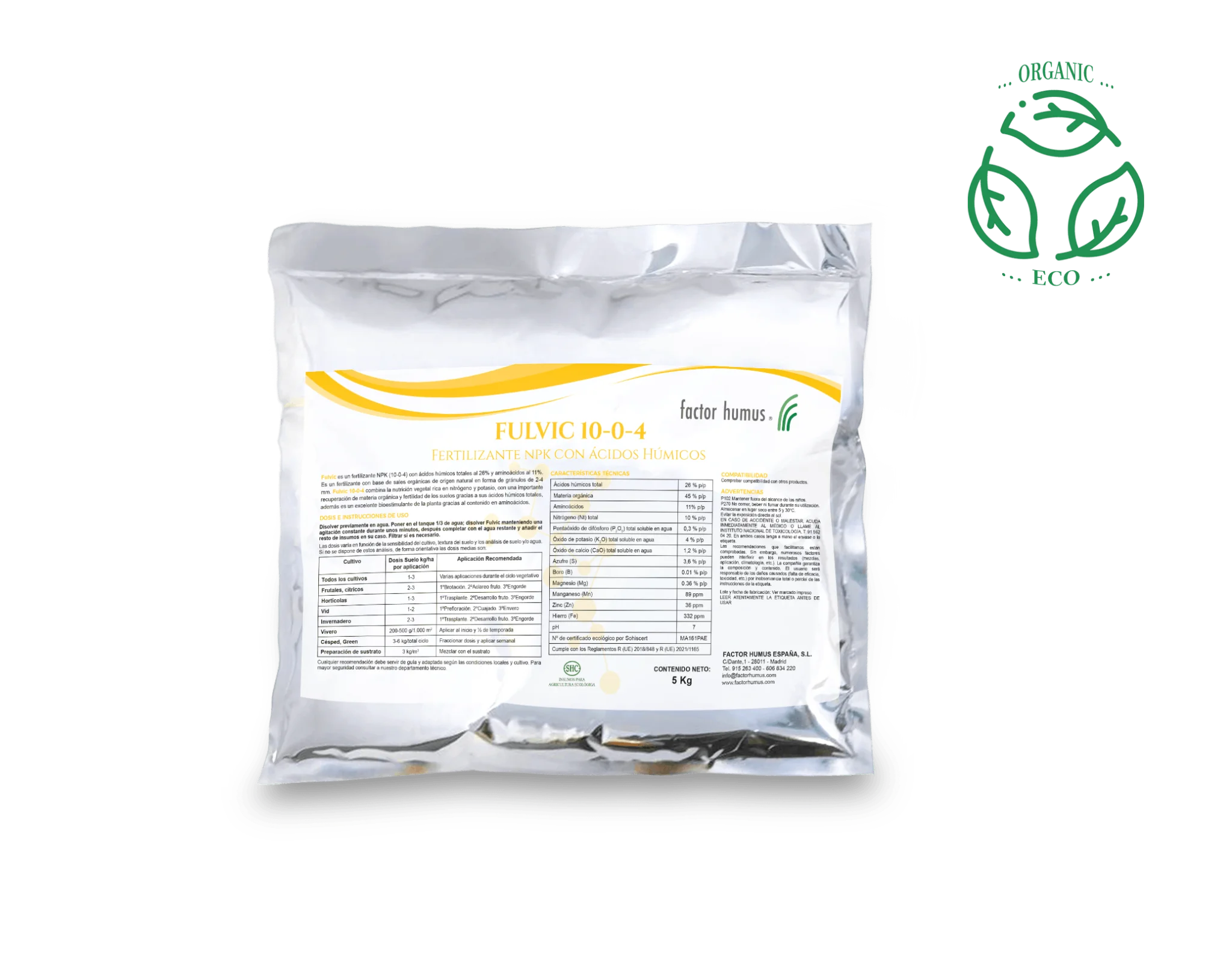 Fulvic 10-0-4 combina la nutrición vegetal rica en nitrógeno y potasio, con una importante recuperación de materia orgánica y fertilidad de los suelos gracias a sus ácidos húmicos totales. Además, es un excelente bioestimulante de la planta gracias al contenido en aminoácidos.
